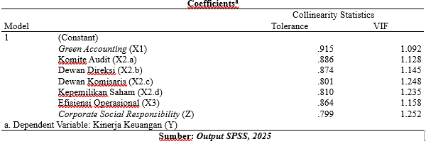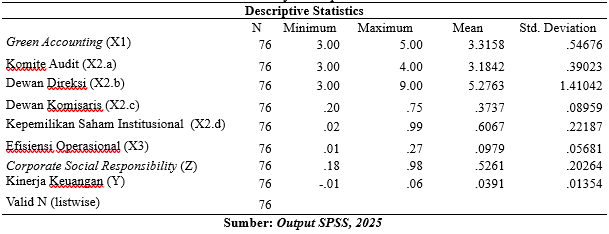 Berdasarkan hasil analisis deskriptif terhadap 76 sampel, rata-rata nilai Green Accounting adalah sebesar 3,32 dalam skala 1–5 dengan nilai minimum 3,00 dan maksimum 5,00. Hal ini menunjukkan bahwa perusahaan telah menerapkan praktik akuntansi hijau pada tingkat sedang hingga tinggi. Tidak ditemukan perusahaan dengan penerapan rendah, dan penyebaran data tergolong moderat sebagaimana terlihat dari nilai standar deviasi 0,54676. Untuk variabel Good Corporate Governance (GCG) menggunakan empat proksi pengukuran yakni, Komite Audit (X2.a) memiliki nilai rata-rata 3,18 dengan standar deviasi 0,39023, Dewan Direksi (X2.b) memiliki nilai rata-rata 5,28 dan standar deviasi 1,41042, Dewan Komisaris (X2.c) memiliki nilai rata-rata 0,37 dan standar deviasi 0,08959 dan Kepemilikan Saham Institusional (X2.d) memiliki nilai rata-rata 0,61 dengan standar deviasi 0,22187. Dengan demikian, secara keseluruhan implementasi prinsip-prinsip Good Corporate Governance sudah cukup baik dalam hal struktur audit dan kepemilikan institusional, namun masih perlu ditingkatkan dalam hal independensi dewan komisaris agar tercipta sistem tata kelola yang lebih akuntabel dan transparan.Variabel Efisiensi Operasional memiliki rata-rata 0,098, sebaran nilainya berkisar antara 0,01 hingga 0,27 mencerminkan adanya variasi efisiensi yang cukup signifikan antar perusahaan. Nilai standar deviasi sebesar 0,05681 menegaskan bahwa perbedaan efisiensi cukup nyata di antara perusahaan-perusahaan dalam sampel. Pada variabel Corporate Social Responsibility (CSR) nilai rata-rata sebesar 0,53 menunjukkan bahwa perusahaan telah cukup aktif dalam menjalankan dan melaporkan kegiatan sosialnya. Namun, dengan nilai minimum 0,18 dan maksimum 0,98 terlihat bahwa partisipasi CSR sangat beragam di antara perusahaan, sebagaimana menunjukkan standar deviasi yang relatif tinggi yaitu 0,20264. Sementara itu, Kinerja Keuangan menunjukkan nilai rata-rata sebesar 0,039 dengan nilai minimum -0,01 dan maksimum 0,06. Hal ini mengindikasikan bahwa secara umum kinerja keuangan perusahaan berada pada tingkat yang cukup baik dan stabil, namun dengan adanya nilai minimum negatif mengindikasikan bahwa terdapat perusahaan yang mengalami kondisi keuangan kurang baik atau merugi pada periode pengamatan. Standar deviasi yang kecil 0,01354 menunjukkan bahwa terdapat perbedaan antar perusahaan, namun tidak terdapat penyimpangan yang ekstrem. Dengan demikian, data statistik deskriptif menunjukkan bahwa terdapat keragaman dalam seluruh variabel yang diamati. Semua variabel memiliki variasi data dan tidak ditemukan nilai outlier ekstrem. Hal ini menunjukkan bahwa data cukup layak untuk dianalisis lebih lanjut.