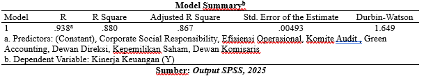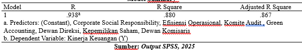 Nilai R Square sebesar 0,880 mengindikasikan bahwa 88,0% variasi dapat dijelaskan oleh variasi kinerja keuangan perusahaan (Y) terhadap variabel Green Accounting (X1), Good Corporate Governance (X2), Efisiensi Operasional (X3), dan Corporate Social Responsibility (Z), sedangkan sisanya sebesar 12% dipengaruhi oleh faktor lain di luar model yang tidak diteliti dalam penelitian ini. Sementara itu, nilai Adjusted R Square sebesar 0,867 menunjukkan nilai R Square yang telah disesuaikan dengan jumlah prediktor dalam model.