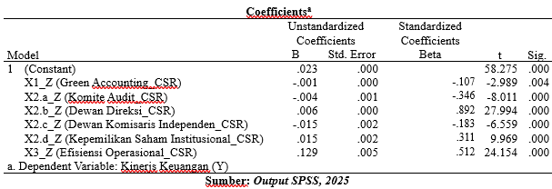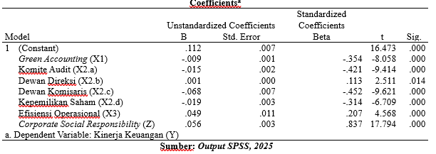 Berdasarkan tabel di atas, diketahui bahwa seluruh variabel independen signifikan terhadap kinerja keuangan perusahaan (p-value < 0,05). Penjelasan masing-masing pengaruh adalah sebagai berikut: Green Accounting (X1) memiliki koefisien regresi sebesar -0,009 dengan nilai signifikansi 0,000, yang berarti berpengaruh negatif dan signifikan terhadap kinerja keuangan. Artinya, semakin tinggi penerapan Green Accounting, maka kinerja keuangan perusahaan cenderung menurun. Hal ini dapat terjadi jika penerapan Green Accounting belum efektif atau memerlukan biaya operasional tambahan; Good Corporate Governance (X2) menunjukkan analisis regresi ditemukan bahwa dari empat indikator Good Corporate Governance (GCG) hanya Dewan Direksi yang berpengaruh positif dan signifikan terhadap Kinerja Keuangan, dengan koefisien sebesar 0,001 dan signifikansi 0,014 menunjukkan bahwa semakin efektif peran dewan direksi, maka semakin baik kinerja keuangan perusahaan. Sementara itu, tiga indikator lainnya yaitu Komite Audit, Dewan Komisaris Independen, dan Kepemilikan Saham Institusional justru menunjukkan pengaruh negatif dan signifikan terhadap Kinerja Keuangan, masing-masing dengan koefisien -0,015; -0,068; dan -0,019 serta signifikansi 0,000. Hal ini mengindikasikan bahwa keberadaan struktur pengawasan yang tinggi tanpa efektivitas kerja yang memadai justru dapat menjadi hambatan dalam peningkatan kinerja keuangan perusahaan.; Efisiensi Operasional (X3) memiliki pengaruh positif dan signifikan dengan koefisien regresi sebesar 0,049 dan signifikansi 0,000 (< 0,05) menunjukkan bahwa Efisiensi Operasional memiliki pengaruh positif dan signifikan terhadap kinerja keuangan. Hal ini berarti perusahaan yang mampu mengoptimalkan penggunaan sumber daya dan menekan biaya operasional dapat meningkatkan margin keuntungan dan performa keuangan secara keseluruhan.