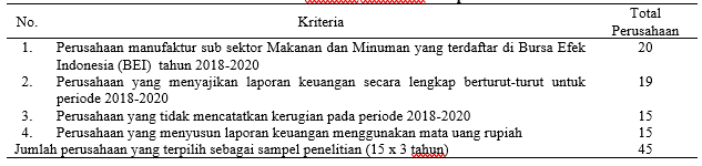Populasi penelitian ini yaitu perusahaan manufaktur sub sektor food and baverage yang terdaftar di Bursa Efek Indonesia (BEI) tahun 2018 - 2020. Teknik pengambilan sampel pada penelitian ini dilakukan dengan cara purposive sampling yang dipilih berdasarkan kriteria tertentu sesuai dengan tujuan penelitian. . Berikut merupakan kriteria yang ditentukan dalam pengambilan sampel :
