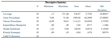Hasil pada tabel statistik deskriptif menunjukkan terdapat 45 data observasi, yang merupakan hasil dari 3 tahun periode penelitian, yaitu 2018 hingga 2020 dikalikan dengan 15 perusahaan yang dijadikan sampel.