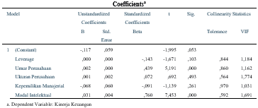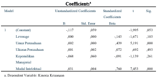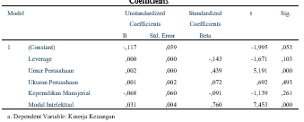 Adapun arti dari koefisien regresi tersebut adalah apabila kelima variabel yaitu Leverage, Umur Perusahaan, Ukuran Perusahaan, Kepemilikan Manajerial dan Modal Intelektual sama dengan nol, maka Kinerja Keuangan (ROA) sebesar 11,7 persen. Jika nilai koefisien regresi variabel X1 yaitu Leverage bernilai positif sebesar 0,000, maka apabila variabel X1 meningkat, variabel Y juga akan meningkat, begitu pula sebaliknya. Jika nilai koefisien regresi variabel X2 yaitu Umur Perusahaan bernilai positif sebesar 0,002, maka apabila variabel X2 meningkat, variabel Y juga akan meningkat, begitu pula sebaliknya. Jika nilai koefisien regresi variabel X3 yaitu Ukuran Perusahaan bernilai positif sebesar 0,001, maka apabila variabel X3 meningkat, variabel Y juga akan meningkat, begitu pula sebaliknya. Jika nilai koefisien regresi variabel X4 yaitu Kepemilikan Manajerial bernilai negatif sebesar -0,068, maka apabila variabel X4 meningkat, variabel Y akan menurun, begitu pula sebaliknya. Jika nilai koefisien regresi variabel X5 yaitu Modal Intelektual bernilai positif sebesar 0,031, maka apabila variabel X5 meningkat, variabel Y juga akan meningkat, begitu pula sebaliknya.