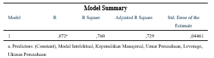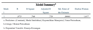 Dari hasil perhitungan yang telah dilakukan, diperoleh informasi bahwa Adjusted R Square sebesar 0,729. Maka dapat disimpulkan bahwa terdapat peran variabel Leverage, Umur Perusahaan, Ukuran Perusahaan, Kepemilikan Manajerial dan Modal Intelektual terhadap Kinerja Keuangan (ROA) sebesar 72,9% sedangkan sisanya 27,1% dijelaskan oleh variabel lain selain variabel tersebut.