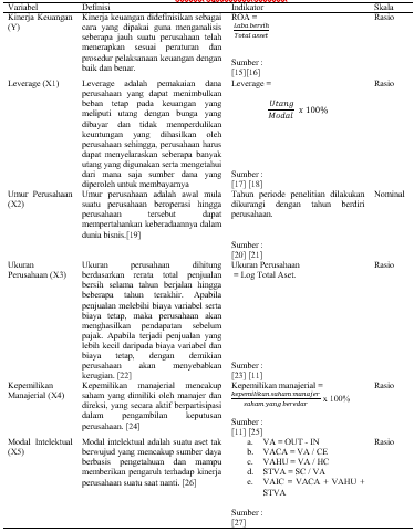 Penelitian ini menggunakan variabel dependen dan variabel independen. Variabel dependen meliputi kinerja keuangan. Variabel independen meliputi leverage, umur perusahaan, ukuran perusahaan, kepemilikan manajerial dan modal intelektual. Berikut merupakan tabel indikator variabel :