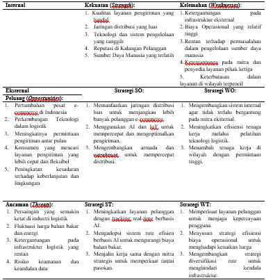 Dengan kondisi ini, strategi yang paling tepat adalah menerapkan strategi agresif, di mana perusahaan harus memanfaatkan kekuatan internal dan peluang eksternal yang ada untuk terus memperluas kapasitas dan meningkatkan efisiensi operasional. Langkah-langkah yang dapat diambil termasuk pengembangan SDM, peningkatan infrastruktur, serta pemanfaatan teknologi untuk optimasi rute pengiriman.