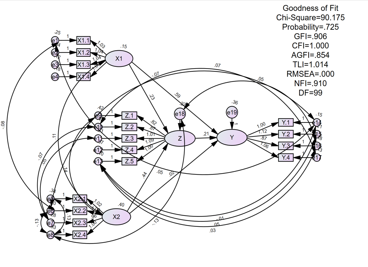 Berdasarkan output Sample Correlations dari AMOS, tidak terdapat nilai korelasi antar konstruk eksogen yang melebihi 0.90. Nilai korelasi tertinggi yang ditemukan, yaitu 0.811, terjadi antara indikator dalam satu konstruk (Z.4 dengan Z.5), sehingga tidak termasuk indikasi multikolinieritas. Dengan demikian, dapat disimpulkan bahwa model ini bebas dari masalah multikolinieritas.