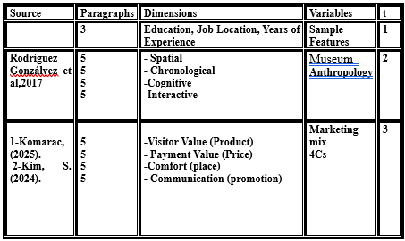 3-Dimensions: Through the research interest of many specialists, a number of scientific models were presented that were developed to determine the dimensions of museum anthropology, and the researcher adopted the Rodriguez Gonzalez et 2017,al model as the closest to the employment processes of this scientific field in the field of tourism activity, and this model defined the dimensions with the points below:( Rodríguez Gonzálvezet, 2017:80-92 )