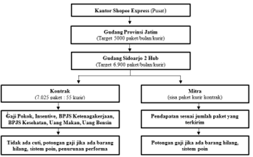 Skema kerja kurir diatas memperlihatkan rangkaian alur pembagian paket. Menurut hasil wawancara yang diperoleh, paket pesanan pelanggan bertitik pusat di gudang provinsi masing-masing daerah. Yang mana hal tersebut merupakan hasil penyatuan paket dari beberapa seller, yang nantinya akan di kirimkan menjadi satu ke gudang hub kabupaten. Dan selanjutnya akan dipecah sesuai dengan pembagian wilayah di setiap gudang. Pada pembagian paket ini, pihak gudang shopee provinsi menargetkan sebanyak 5000 paket yang harus diselesaikan oleh pihak kurir dalam satu bulan. Namun, pada gudang kabupaten sidoarjo 2 hub target pengiriman paket yang diberikan pada kurir mengalami kenaikan. Yakni sekitar 1900 paket sehingga menjadi 6900 paket perbulan. Hal ini disebabkan guna menutupi adanya kekurangan target pada kurir dibulan tersebut, juga jika terjadi kehilangan paket. Pembagian paket yang ditargetkan ini hanya berlaku pada kurir kontrak. Hal ini disebabkan, kurir kontrak berbeda dengan kurir mitra. Dimana kurir kontrak merupakan pekerja tetap yang terkontrak secara resmi dan kurir mitra merupakan pekerja freelance yang tidak terkontrak secara resmi. Kurir kontrak setiap harinya memiliki target paket, yang mana membawa sekitar kurang lebih 210 paket yang harus dikirim. Sedangkan kurir mitra tidak memiliki target dan hanya membawa paket sisa jika para kurir kontrak sudah mencapai target bawaan perharinya.