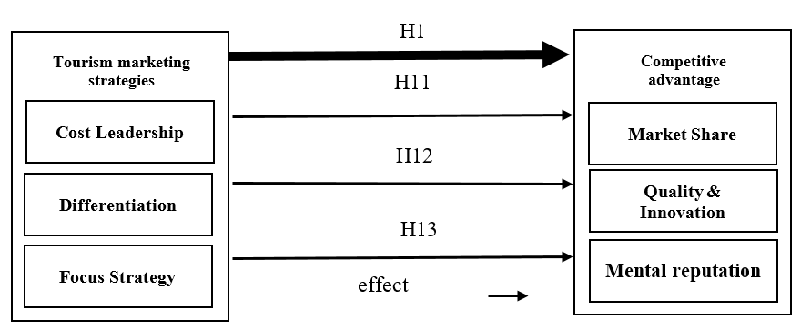 The effectiveness of a marketing strategy in achieving a tourism organization's objectives stems from the organization's understanding of the competitive landscape, the surrounding environment, and its internal resources. A marketing strategy is fundamental to achieving competitive advantage for various tourism and other organizations. Tourism marketing strategies contribute to achieving a competitive advantage for the organization. Adopting a low-cost strategy or a cost-focused approach creates a cost leadership advantage, while adopting a differentiation strategy or a product-differentiation strategy creates an organizational advantage. This is due to several factors and circumstances that lead the organization to choose between these strategies, such as the organization's objectives, capabilities, the nature of the target market, and the nature of the competition. These strategies are [19]: