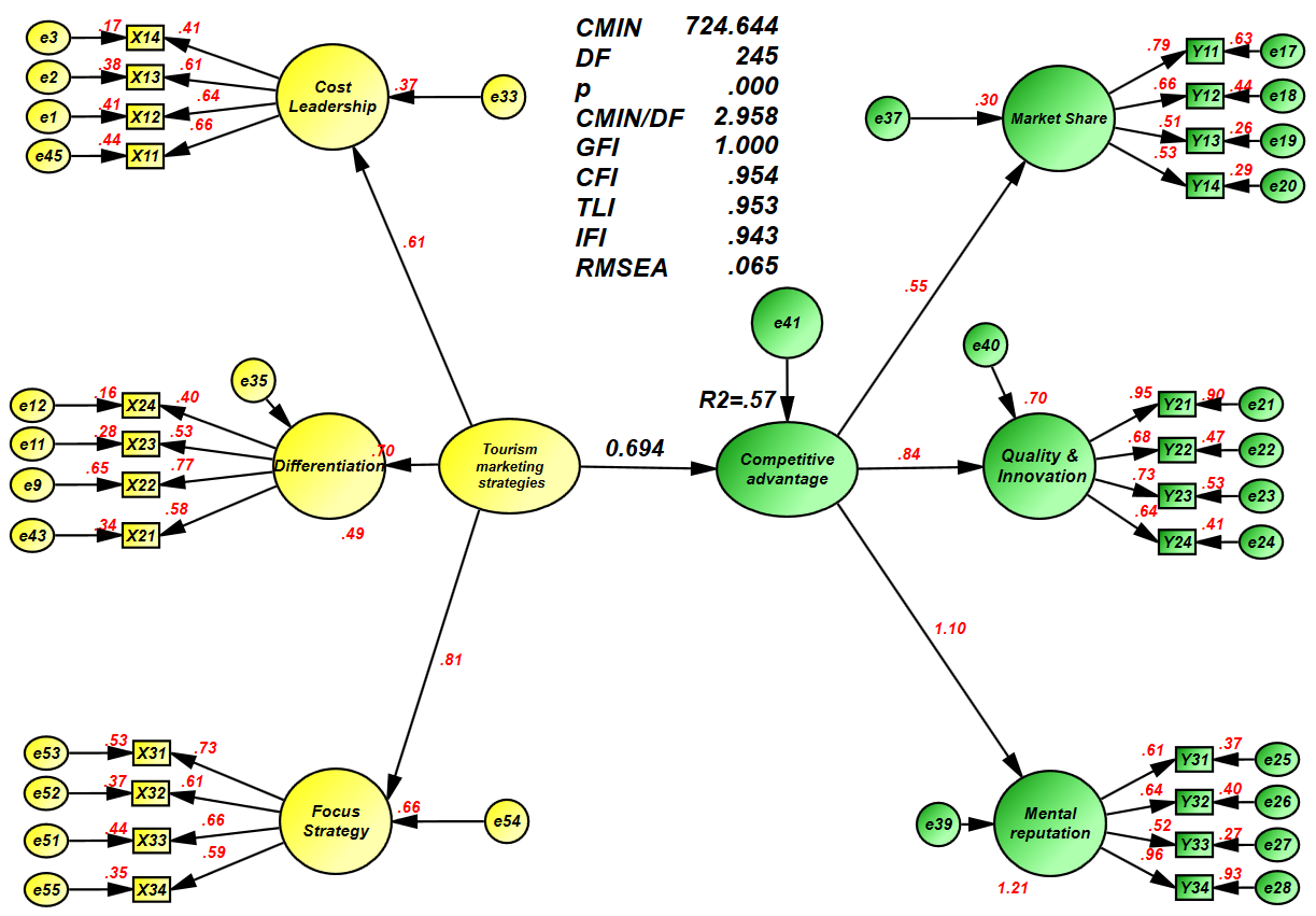 Structural equation modeling is a statistical method for studying and modeling relationships among variables. It demonstrates the dependence of one variable, the dependent variable, on one or more independent variables. A mathematical model is constructed to describe the correlation between the dependent variable and the independent variables (tourism marketing strategies and competitive advantage), using the statistical software AMOS (version 26). This model allows measurement of the direct and indirect impacts of tourism marketing strategies on competitive advantage, mediated by strategic consensus.